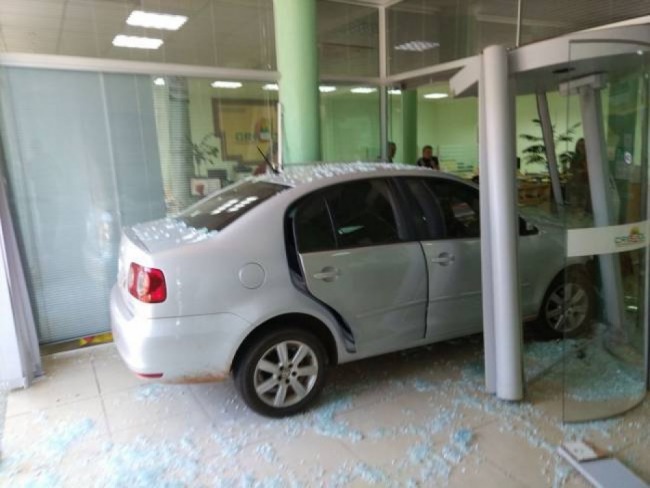 O VW Polo invadiu a calçada e entrou na agência, onde quebrou as portas de entrada e giratória. A condutora é uma idosa de 70 anos.
