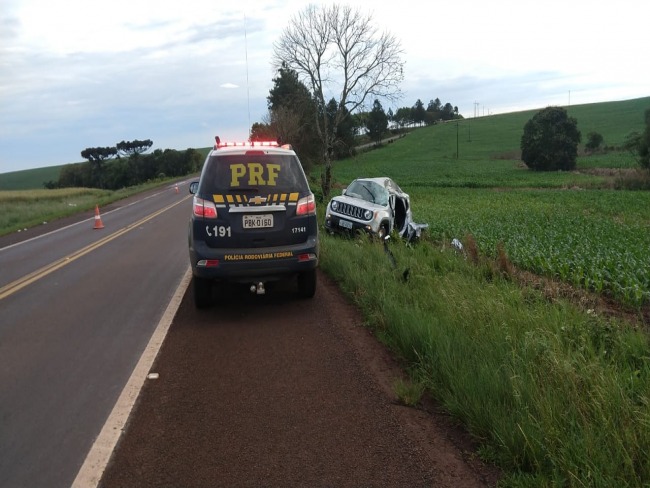Os policiais foram avisados sobre um acidente envolvendo um veículo Jeep Renegade com placas de Palmeira das Missões. O veículo teria perdido controle e saído de pista.